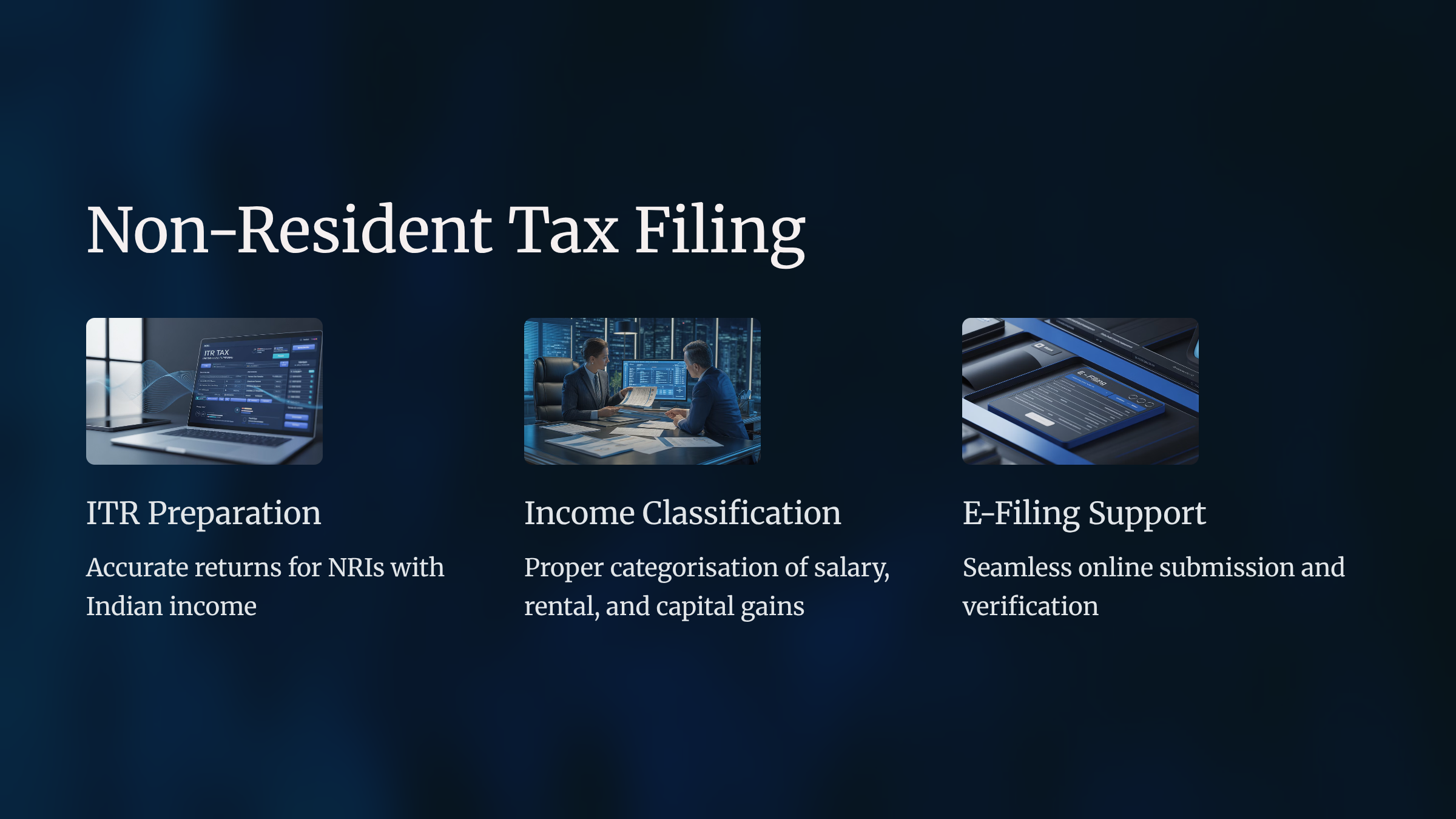NRI taxation is complex due to multiple income sources, foreign assets, and residency rules. We ensure full compliance with Indian tax laws while maximizing benefits through: